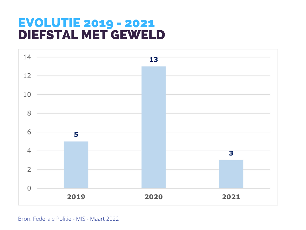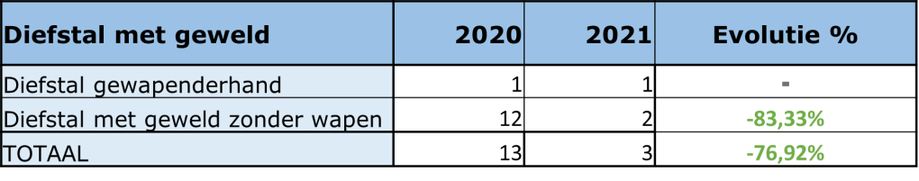 Diefstal met geweld Overzicht Oorzaken & Verklaringen Het aantal diefstallen met geweld kende een opmerkelijke daling met 76,92% t.o.v. 2020.