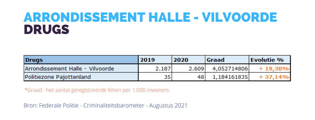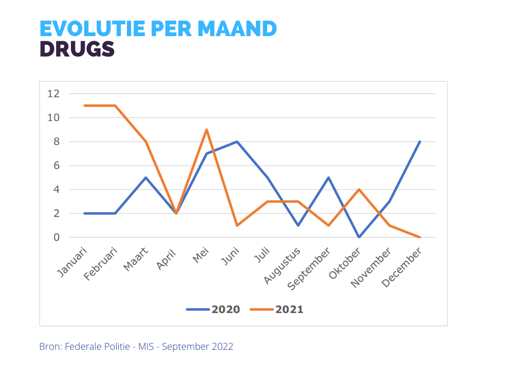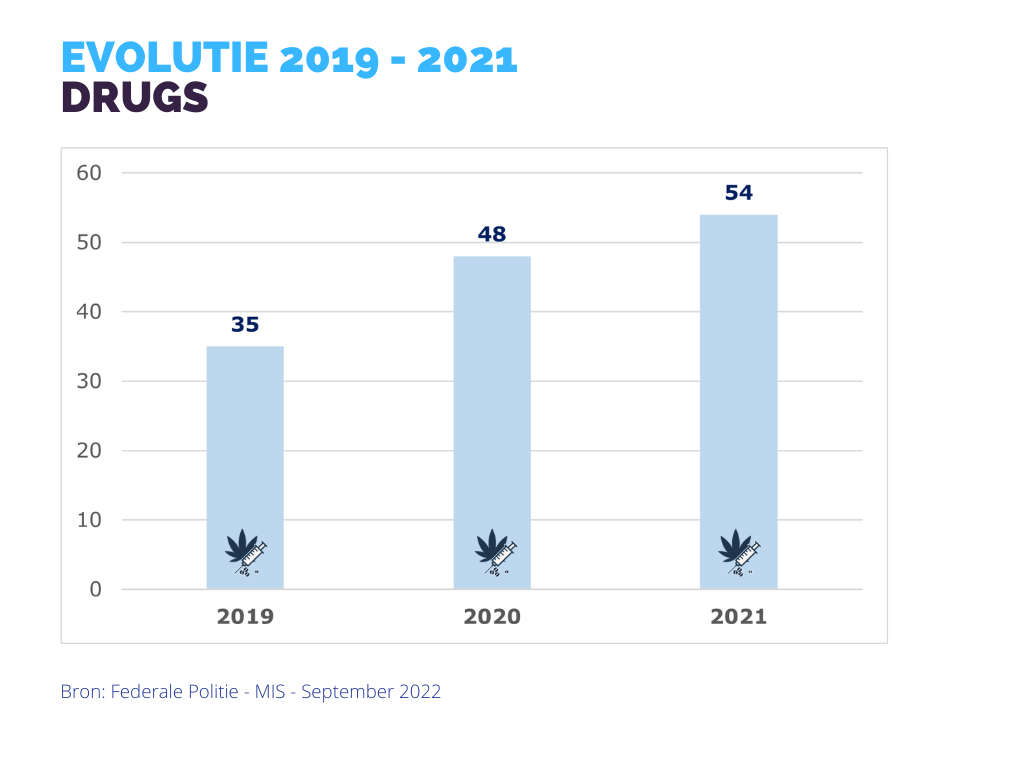 Het aantal inbreuken “drugs” kende een stijging met 13% t.o.v. 2020.