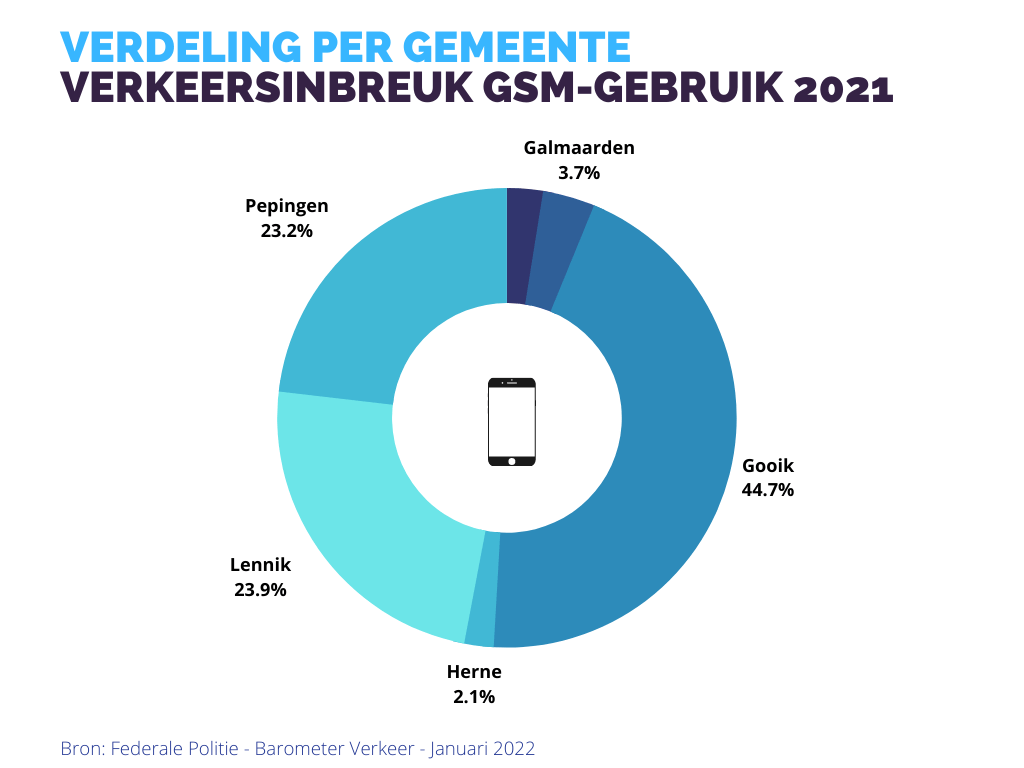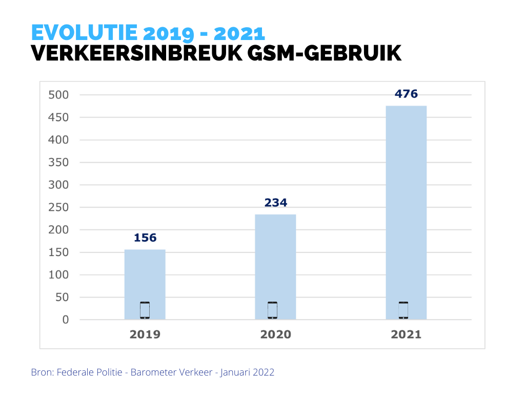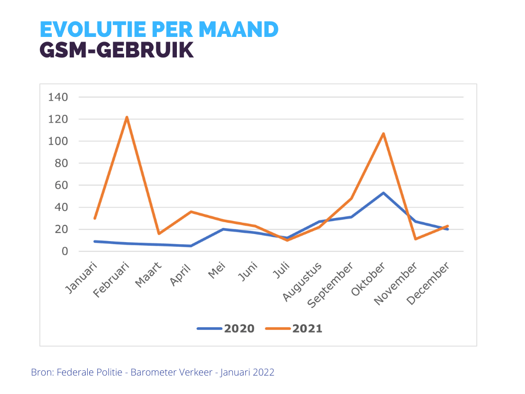 Het aantal verkeersinbreuken met betrekking tot het GSM-gebruik tijdens het rijden kende een sterke stijging met 103,42% t.o.v. 2020.